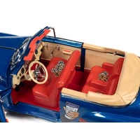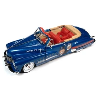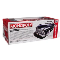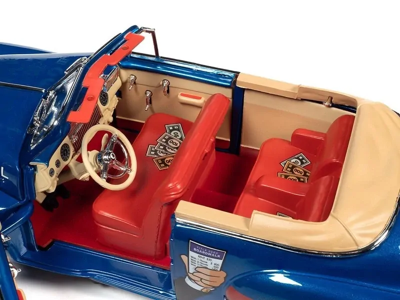 From Round 2. After years of effort, Mr. Monopoly has become the king of real estate. Driving his metallic blue 1947 Cadillac Series 62, he heads towards his latest property venture on Boardwalk with a smile. His Park Place hotel has just opened, and now his vision for Boardwalk is set to become a reality. Auto World pays homage to Rich Uncle Pennybags with this 1:18 scale die-cast replica of his Cadillac, featuring Monopoly graphics and a resin figure of Mr. Monopoly on a stack of cash. This model boasts a detailed engine, steerable front wheels, accurate interior and chassis, and opening doors and hood