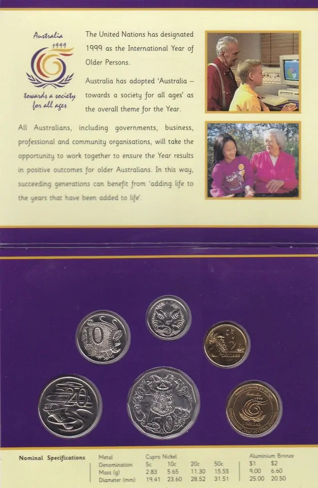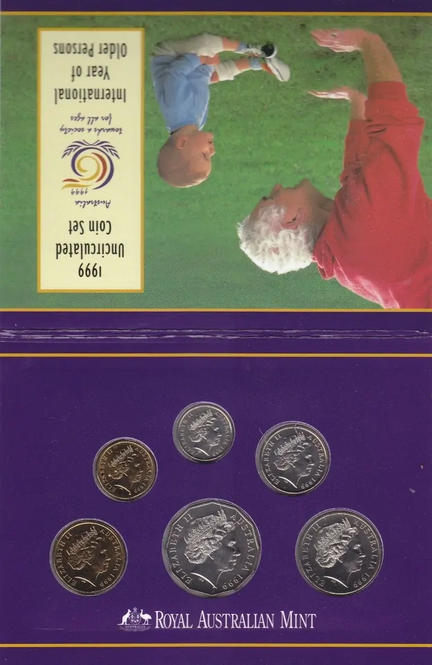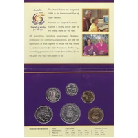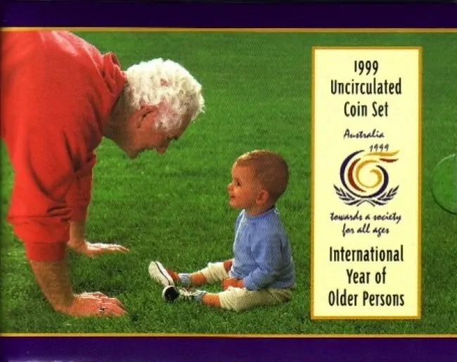 The 1999 Royal Australian Mint uncirculated coin set commemorates the International Year of Older Persons. Includes an uncirculated commemorate $1 coin and the coins are presented in display folder with outer sleeve.
