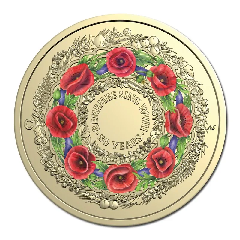 In honour of the courageous Australians who served in the Second World War, the Royal Australian Mint presents these coins. The coins features a wreath of red poppies – an enduring symbol of remembrance in Australia and other Commonwealth nations. Surrounded by sculpted leaves, the eight poppies in the wreath represent the eight decades that have passed since the most devastating war in human history.