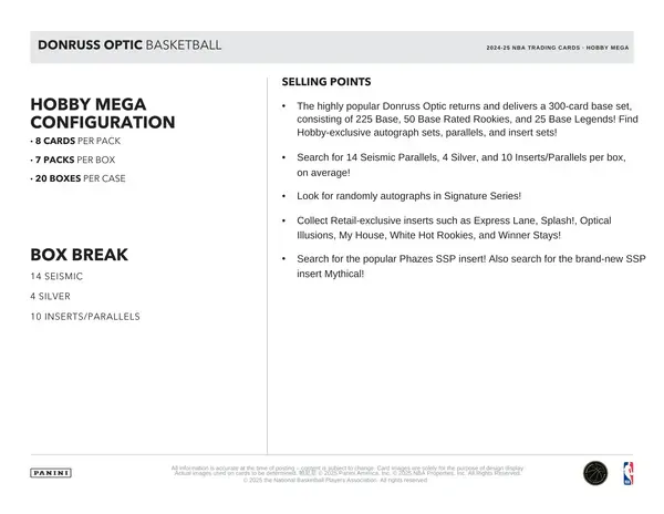The highly popular Donruss Optic returns and delivers a 300-card base set, consisting of 225 Base, 50 Base Rated Rookies, and 25 Base Legends! Find Hobby-exclusive autograph sets, parallels, and insert sets!