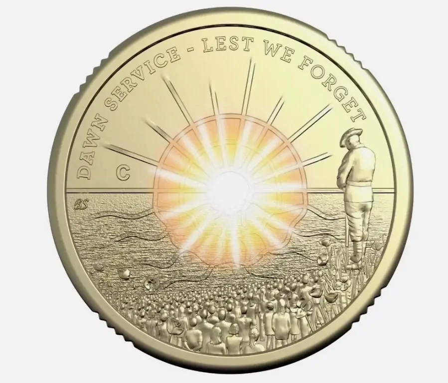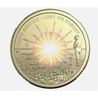This $2 Coloured coin features the sun rising over the ocean along with the Australian Coat of Arms and a soldier reflecting with head bowed for the minute silence of 'Lest We Forget'.