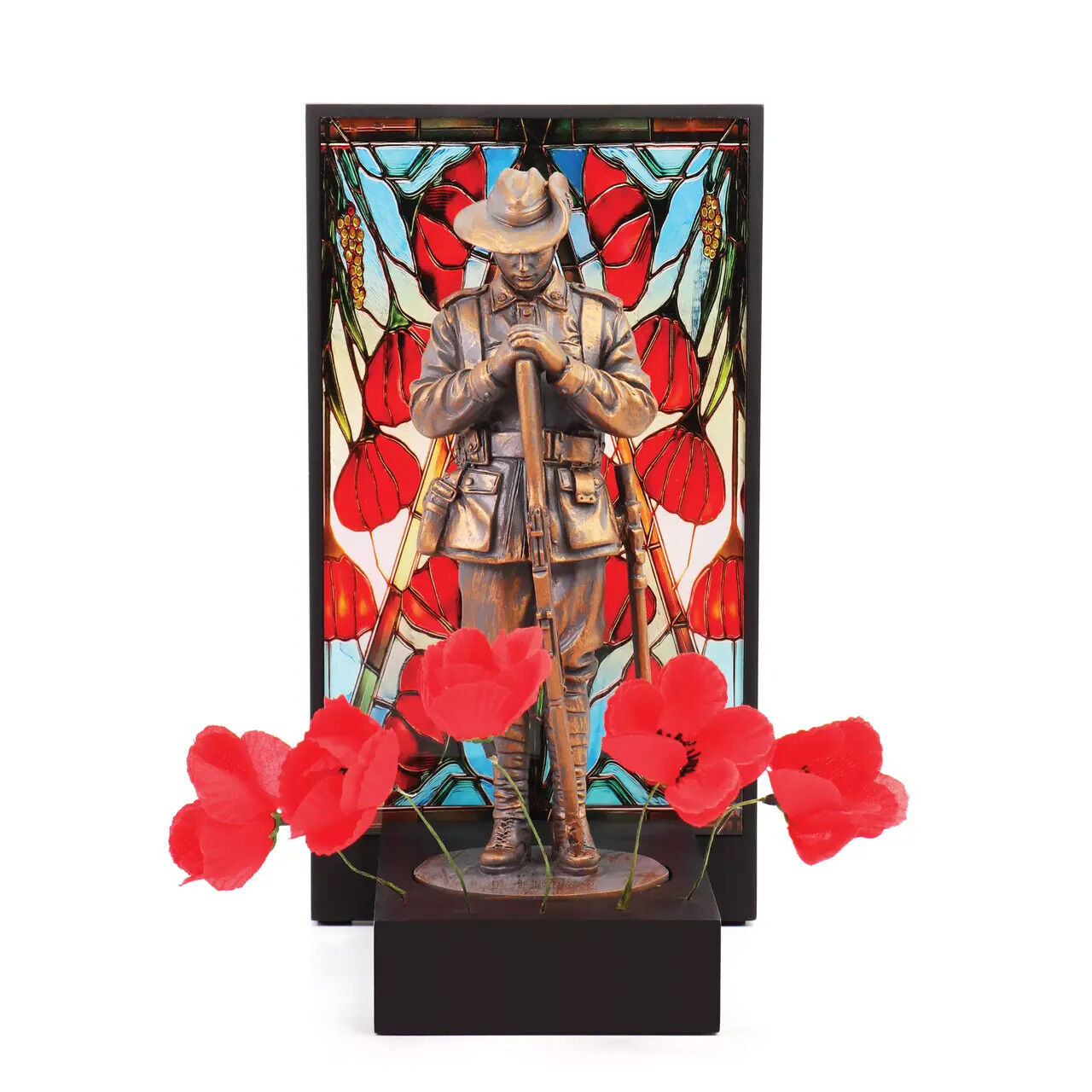 This beautifully crafted miniature figurine is a poignant tribute to our fallen soldiers. It comes with a striking acrylic backdrop, featuring an intricate stained-glass poppy design that adds depth and significance to the piece. The base of the figurine is adorned with five double-petaled wired poppies. These can be gently bent and arranged to create your own personalised field of remembrance in front of the soldier, who stands in the solemn pose of Resting on Reverse Arms.