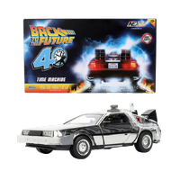 Featuring a die-cast body with premium chrome deco and screen-accurate detailing, this Time Machine includes rubber tires, detailed interiors, and opening gullwing doors. The hover-conversion wheels add an extra level of authenticity, capturing the look and feel of the iconic vehicle from the films.