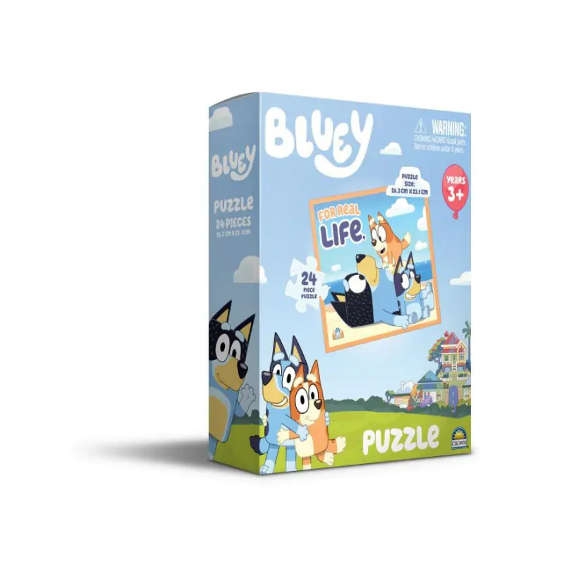 Starring the lovable ABC pooch, Bluey and her family, these adorable 24 piece puzzles will delight any fan! Available in 2 cute designs featuring Bluey and Bingo and another with their dad Bandit. Each puzzle measures 26.1cm x 23.1cm. Suitable for ages 3 and up.