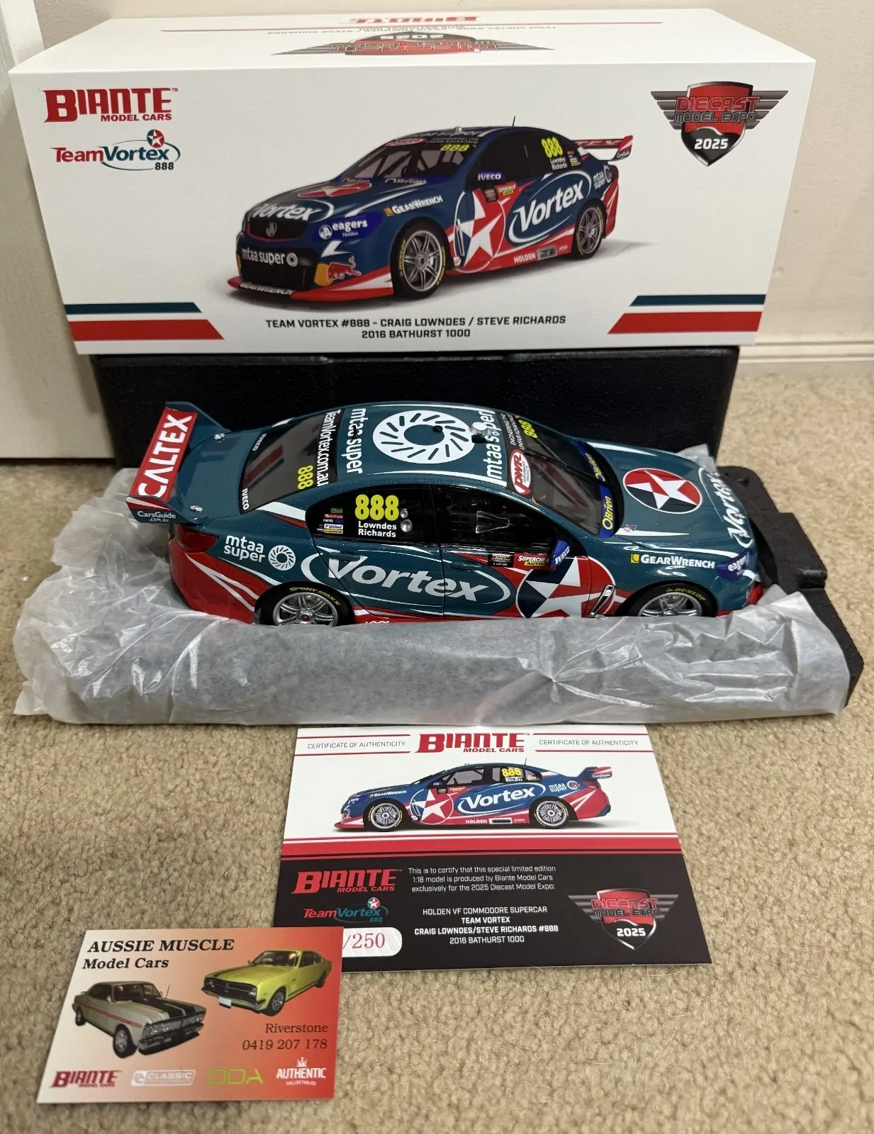 Biante model cars are producing the 2016 team Vortex Bathurst Holden VF Commodore exclusively for the 2025 Diecast model expo. The livery carries different logo’s to the start of season car and when you compare you will see many subtle differences. This model will feature opening doors, bonnet and boot. Only 300 models in 1:18 will be produced and will come with a certificate of authenticity.