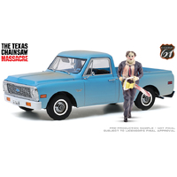 HWY18022 Greenlight Highway 61 - The Texas Chain Saw Massacre (1974) - 1971 Chevrolet® C-10 Pickup Truck (Dirty Version) with Leatherface Figurine. 1:18 scale diecast collectible model. This Chevy® Pickup Truck is a 10.75"L x 4.25"W x 3.75"H diecast metal car. Leatherface figurine is 4.25H. Individually packed in a window box. Box size: 13.25"L x 6.25"W x 5"H. Manufactured by Greenlight. Item HWY18022 is in Light BLUE color (Dusty version).