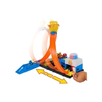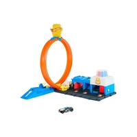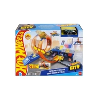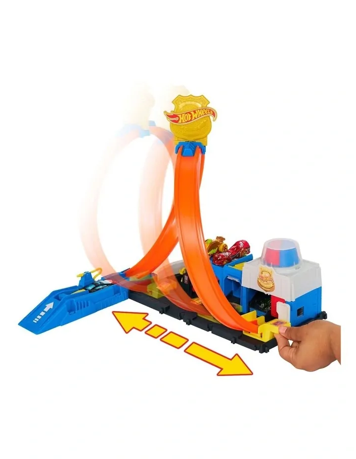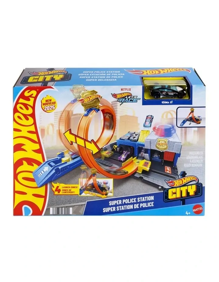 There are four different ways to race and stunt through the Hot Wheels City Super Police Station Playset with its adjustable track! Drive the included 1:64 scale die-cast toy police car into the launcher where there's a flex hose to refuel before heading into action. Slide the loop-track to one of four paths  each one showcases a different stunt or outcome. Park up to four vehicles on the set and attach other tracks and playsets for open-ended play. One car is included; additional vehicles and tracks sold separately. Colours and decorations may vary,