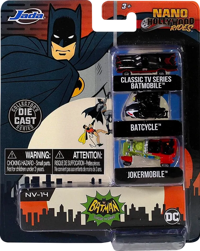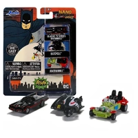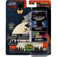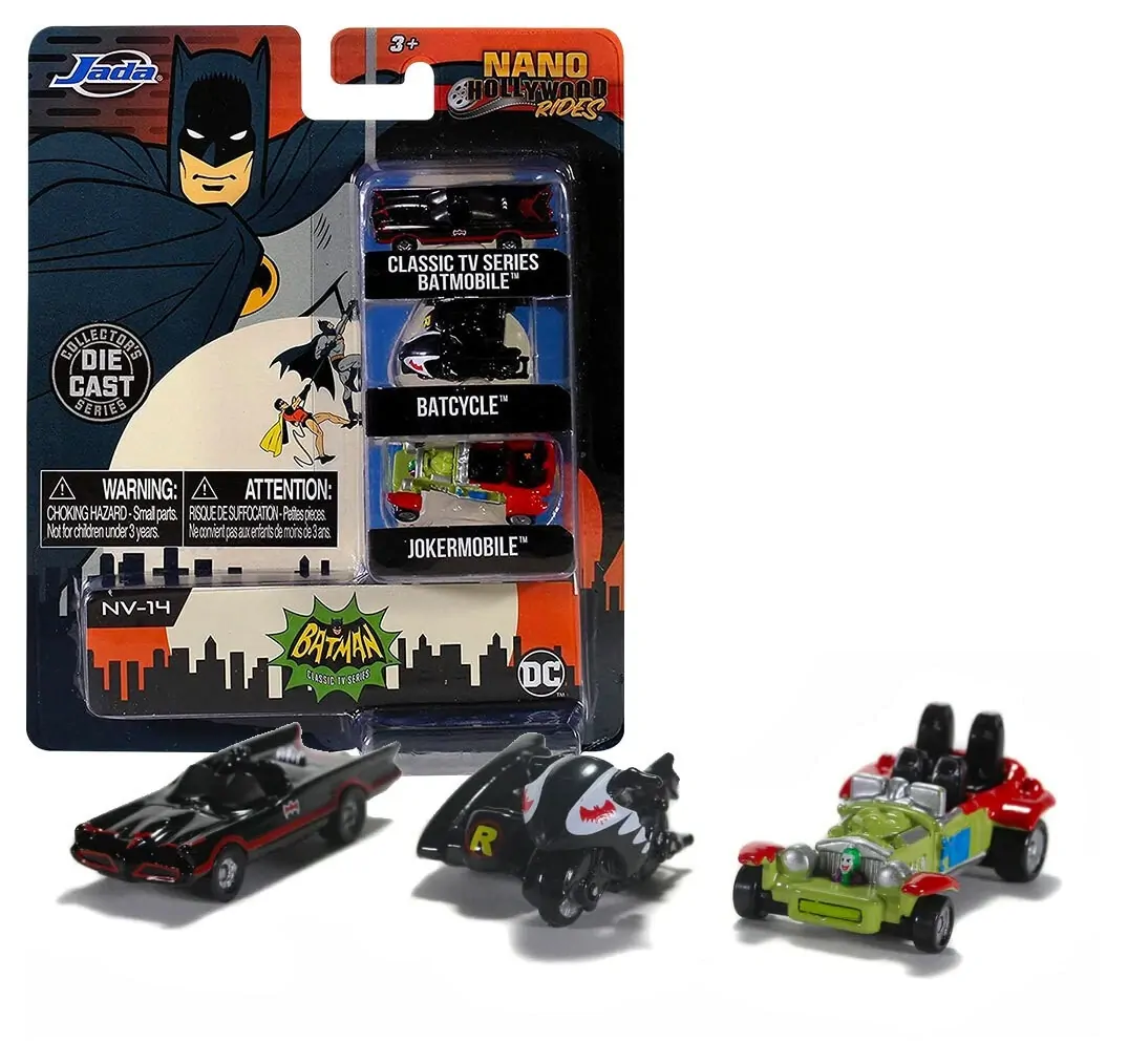 Based on their appearance in the classic 1966 film Batman, the Batmobile, Batcycle and Jokermobile have been brought to life as three 1.5-inch Nano Hollywood Rides Die-Cast Vehicle Replicas!