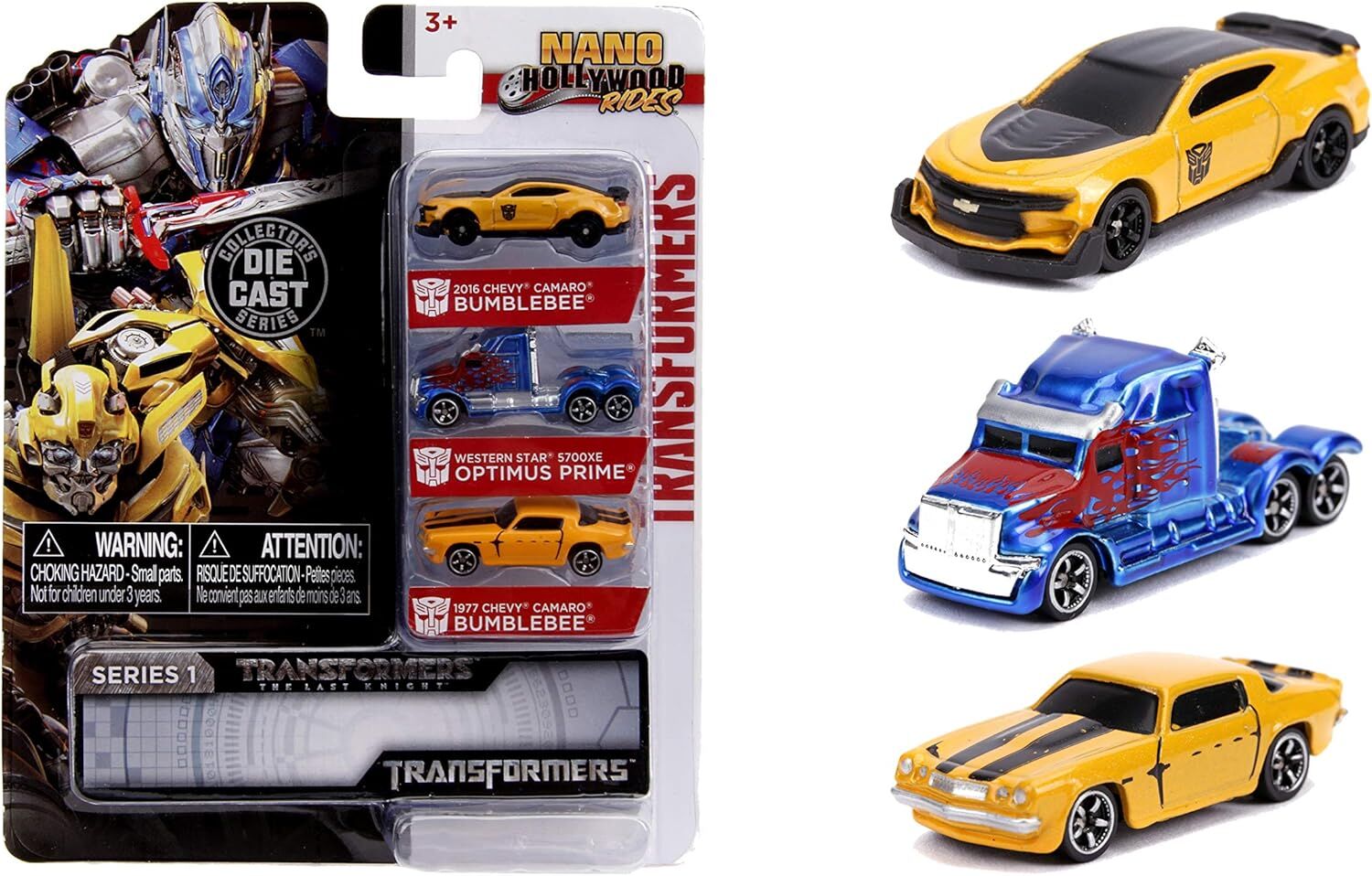 Jada Toys Transformers Nano Hollywood Rides 2016 Chevy Camaro Bumblebee, Western Star 5700XE Optimus Prime and 1977 Chevy Camaro Bumblebee, 1.75" Die-Cast Vehicles