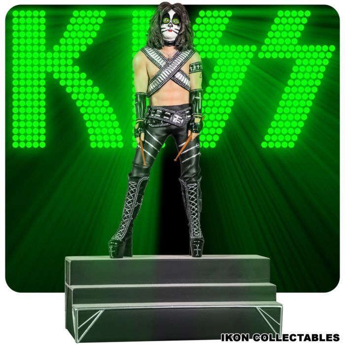 God certainly gave rock and roll to Peter Criss and his on-stage persona 'Catman'. Seen here in this detailed 1/6 scale resin statue, complete with Love Gun era costume and makeup, the Catman strikes a purposeful pose. The tools of his trade, his drumsticks, relaxed but at the ready to bust out any one of the epic songs for which KISS are so known and loved. The base connects with the three other band members to form a unique stage diorama. With only 500 available worldwide, don't delay to secure your own today.
