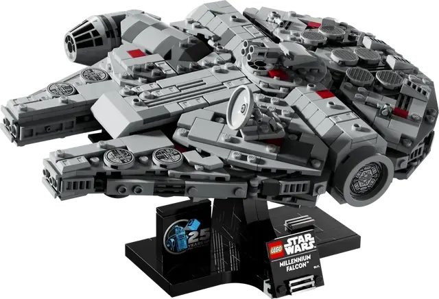 - Made for display – The buildable stand has a nameplate and LEGO® Star Wars™ 25th anniversary brick, and it’s designed to display the Millennium Falcon at a dynamic angle