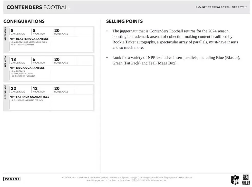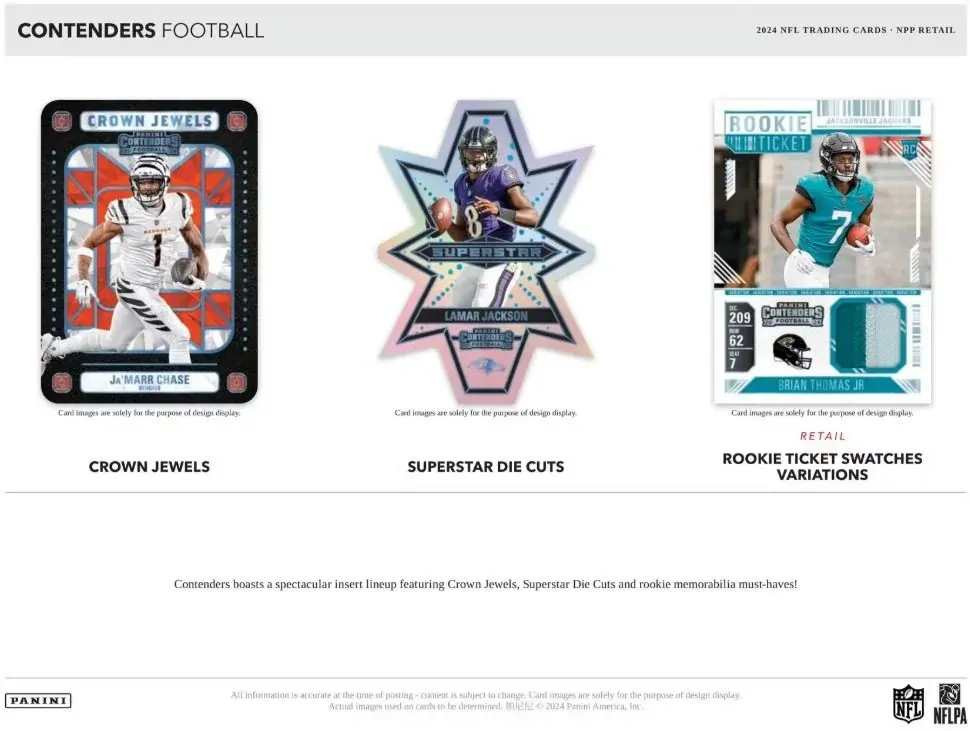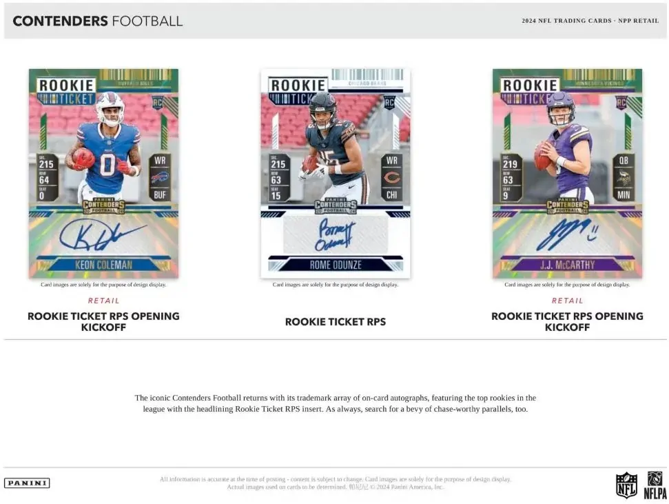 The juggernaut that is Contenders Football returns for the 2024 season, boasting its trademark arsenal of collection-making content headlined by Rookie Ticket autographs, a spectacular array of parallels, must-have inserts and so much more.
