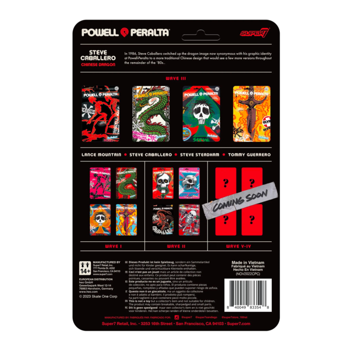 This 3.75" scale, articulated Powell-Peralta ReAction Figure of Steve Caballero features a skeleton body with a green dragon head inspired by the logo on his signature deck.