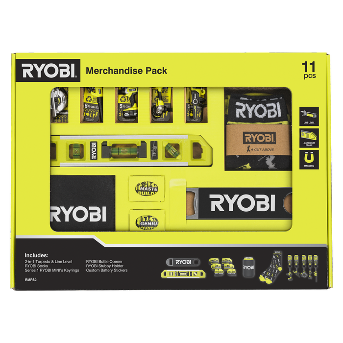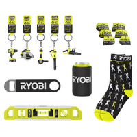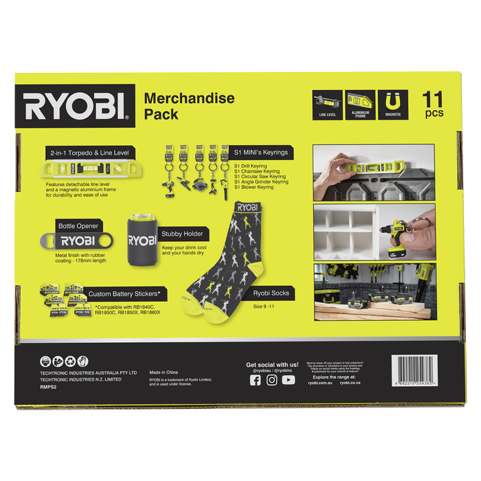 - Pack includes: 2-in-1 Torpedo and Line Level, Pair of Socks (size 9-11), Bottle Opener, Stubby Holder, Custom Battery Stickers and 5 x S1 RYOBI MINI’s Keyrings