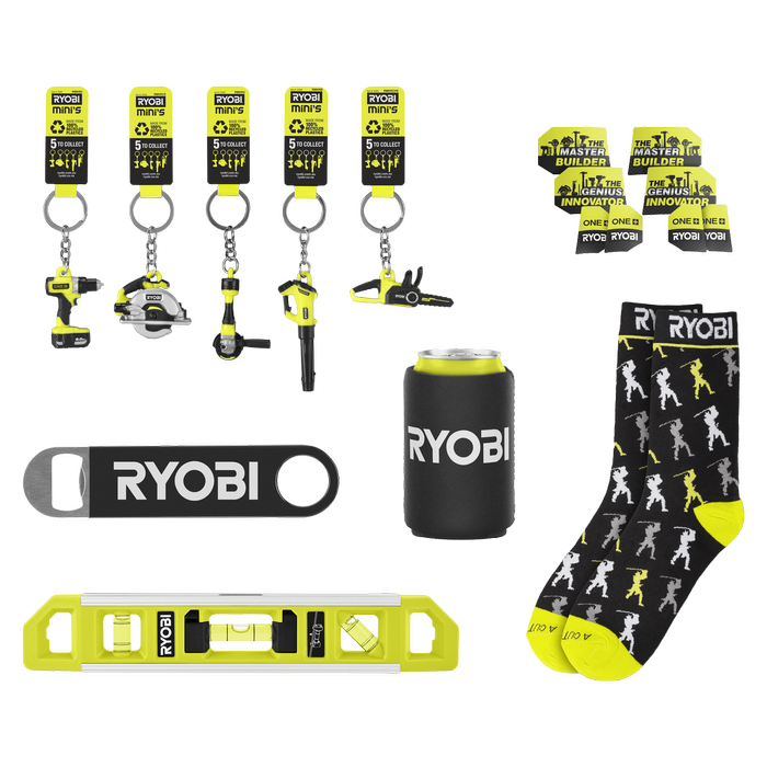 If dad, a friend or a loved one is a RYOBI fan, they’ll love this RYOBI 11-Piece Merchandise Pack. It features a 2-in-1 Torpedo and Line Level, Pair of Socks (size 9-11), Bottle Opener, Stubby Holder, Custom Battery Stickers and 5 x S1 RYOBI MINI’s Keyrings. Ensure photo frames and shelves are mounted straight and level with the 2-in-1 Torpedo and Line Level. It features three separate vials for checking whether objects are plumb, level or sitting at a perfect 45° angle. A magnetic frame makes it easier to attach the Level to metal surfaces for hands-free use. Disconnect the middle vial to use as a Line Level. Run it along a taut string line between two points to verify if objects are level over a long distance. The original five Series 1 RYOBI MINI’s (Drill Driver, Chainsaw, Circular Saw, Angle Grinder and Blower) are included in this Pack. They’re made from 100% recycled plastics, providing a fun way to give resources a new life. Stay tuned for more launches of these collectables at Bunnings Warehouse. They can sell out fast! Anyone who calls themselves a true RYOBI fan will love stepping out in the Socks for the next DIY project. They feature the iconic RYOBI Samurai logo. The Stubby Holder and Bottle Opener are great accessories for the next barbeque, picnic or local sporting event. Please note: RYOBI MINI's are only replicas and are not functional power tools. *Stickers are designed to fit ONE+ battery models RB1850X, RB1860X, RB1840C and RB1850C.