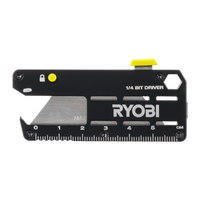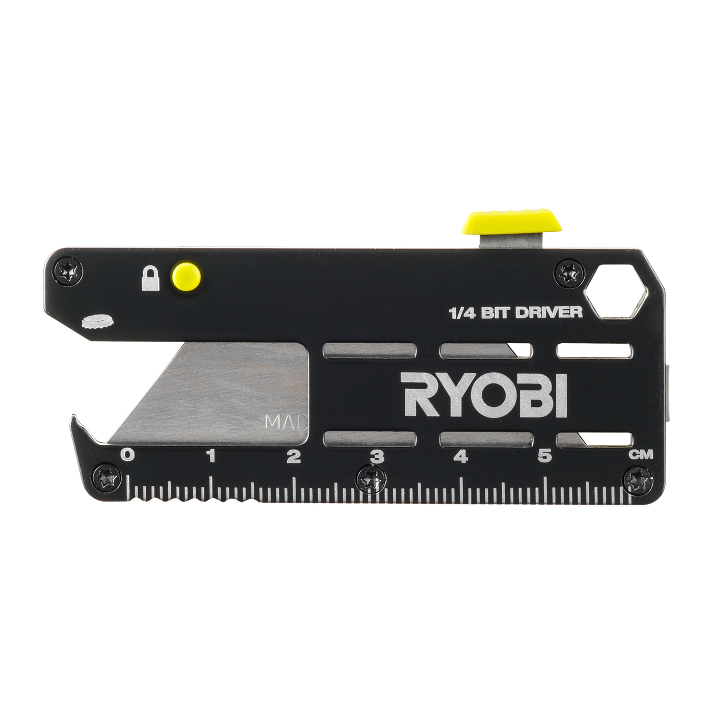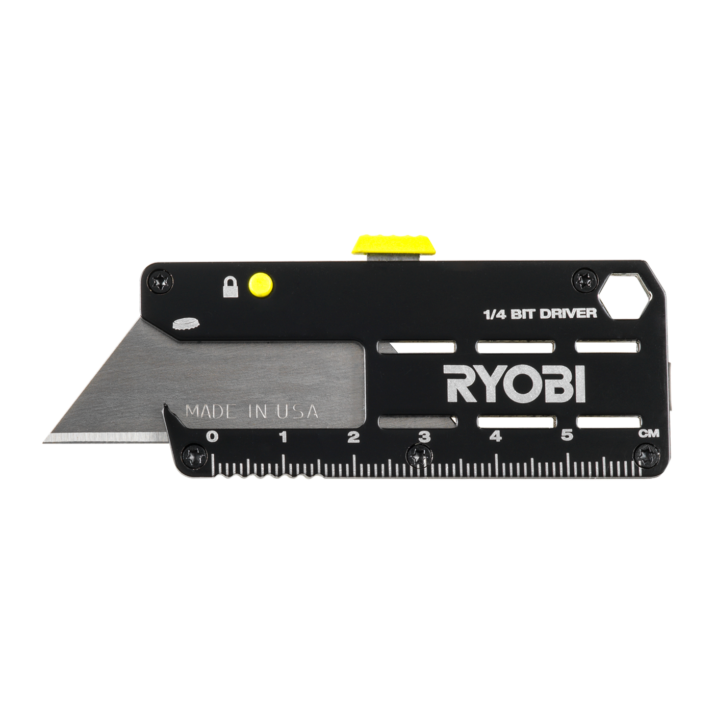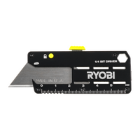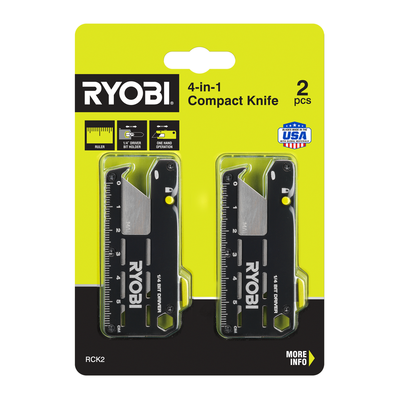Always have a tool on hand for cutting and measuring materials and driving screws with the RYOBI 4-in-1 Compact Knife 2-Piece Set. These compact multi-purpose tools are small enough to fit in your pocket or hang on a keychain. The blade is easy to retract and remove with an integrated slide button and blade lock. The included blade is made in the USA from premium materials for long-lasting sharpness and durability. Replace the blade with any standard utility knife blade. Use the centimetre and inch markings on the bottom edge of the casing to take measurements. The integrated ¼” driver bit holder accepts bits to tighten/loosen screws. The Knives also feature a bottle opener notch to remove bottle caps.