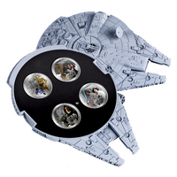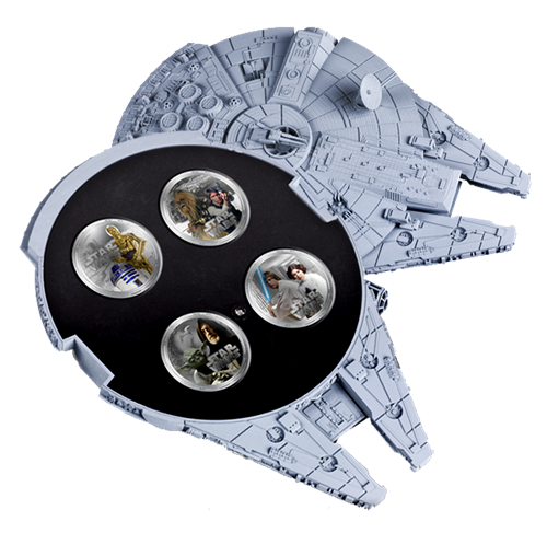 This limited edition silver plated base metal set including your favourite characters Princess Leia, Luke Skywalker, R2-D2 and Darth Vader. The four coins are packaged individually in a sealed blister pack which can then be transferred into the Millenium Falcon case. Each coin in the Star Wars set is struck from Silver Plated base metal. No more than 50,000 of each coin will be issued by the New Zealand Mint. The coins are legal tender of Niue.